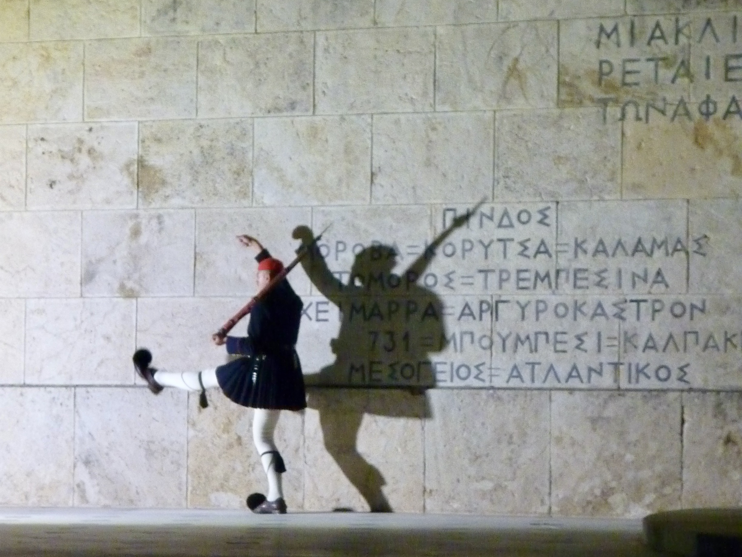 Then suddenly, as often happens in Athens, there was a períptero, selling newspapers, water and souvenirs, obstructing their route. At night, when closed, it was okay. However, during the day, with marquises opened and merchandise displayed, the Evzónes were unable to follow their line of tiles. Not to be bothered by such a minor disturbance though, unblinkingly, they flowed their march a little to the left, around the kiosk, and then right back to their baseline, once they had passed it. I admired their capacity for discipline yet flexibility, their order in natural symbiosis with the chaos of this city. And I felt there was wisdom to be found with these Evzónes.