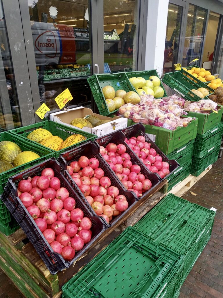 But Turkish food walhalla takes place in the Turkish supermarket just five hundred meters on. You can come there in the morning and there is nobody there. You can come there in the evening and it feels like a dinner party going on. People carefully selecting their fruit and vegetables, buying big portions for big families. And this time of year, it feels like Christmas, harvest time. The fruit and vegetable section is stacked with piles of boxes, with the first pomegranates, the first mandarins, a box of fresh olives above little light green courgettes. Next to small bulbed aubergines in different colours are some small boxes of fresh pistachios. On the other side, fresh figs, the good ones, the small ones, juicy and sweet, purple and green varieties.