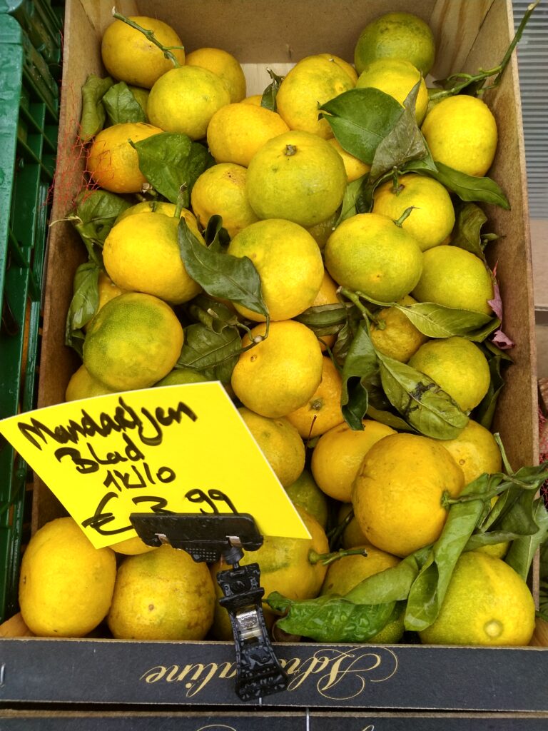 And so I just left with some fruit: a Spanish pear (new harvest, green with a beautiful red gloss), and a couple of mandarins that I had picked specifically for the beauty of the leaves still on them.