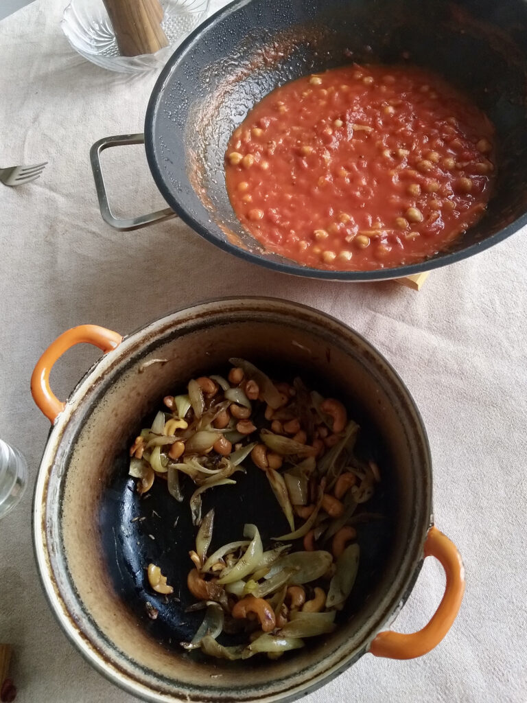 And so, recently, I wanted to cook a nice meal for my father. It was a hard day’s night, one of several that week. We were both dead tired and I was looking for something for us both to enjoy. In my parents’ cupboard, I stumbled upon one of Nigel Slater’s cookbooks, where I found the perfect recipe. For chickpeas and spiced tomato sauce, topped with sauteed onions and cashew nuts. Something in the direction my father enjoys making, something with ingredients I was going to stomach well, flavours I wanted to explore. I bought the ingredients, prepared everything before leaving. To finish the last bits when we would get home hungry.